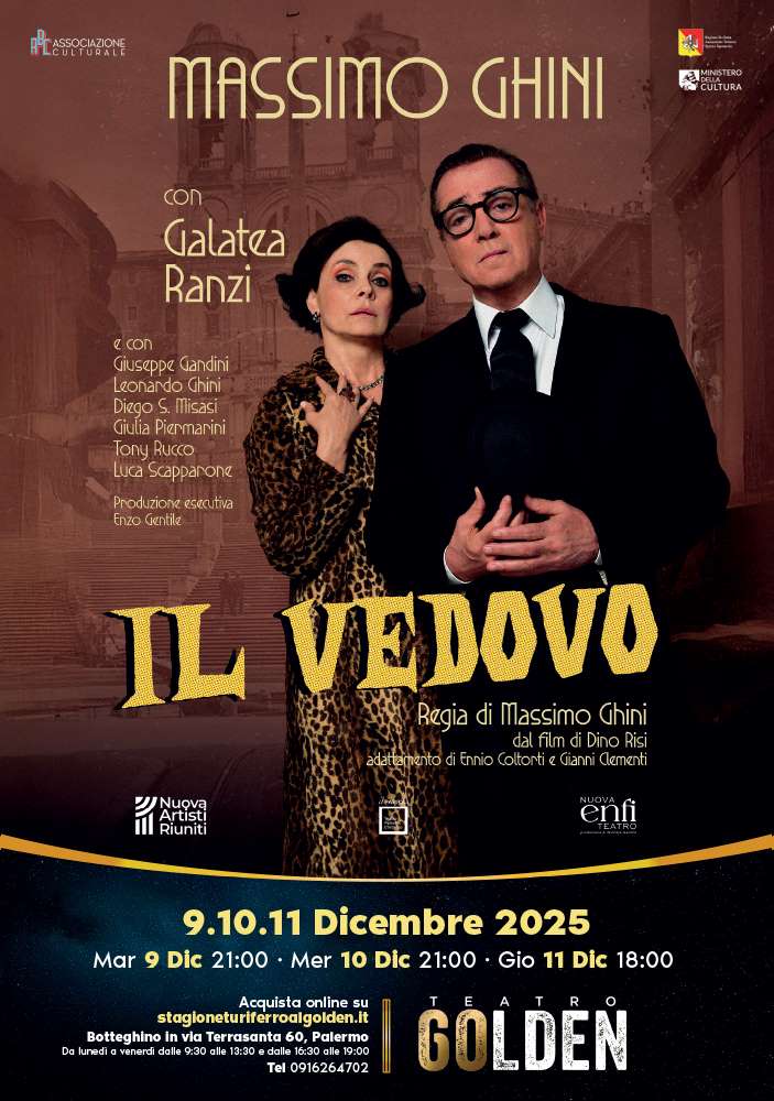 PALERMO. Un capolavoro della commedia all’italiana rivive in teatro. Dal 9 all’11 dicembre 2025, il Golden di Palermo è lieto di ospitare “Il vedovo”. Dal celebre film di Dino Risi, un adattamento di Ennio Coltorti e Gianni Clementi, nell’ambito della nuova stagione teatrale Turi Ferro. Sul palcoscenico di Sicilia un superbo Massimo Ghini, che firma anche la regia della pièce prodotta da Nuova Enfi Teatro, Nuova Artisti Riuniti e Il Parioli. Al suo fianco la splendida Galatea Ranzi.